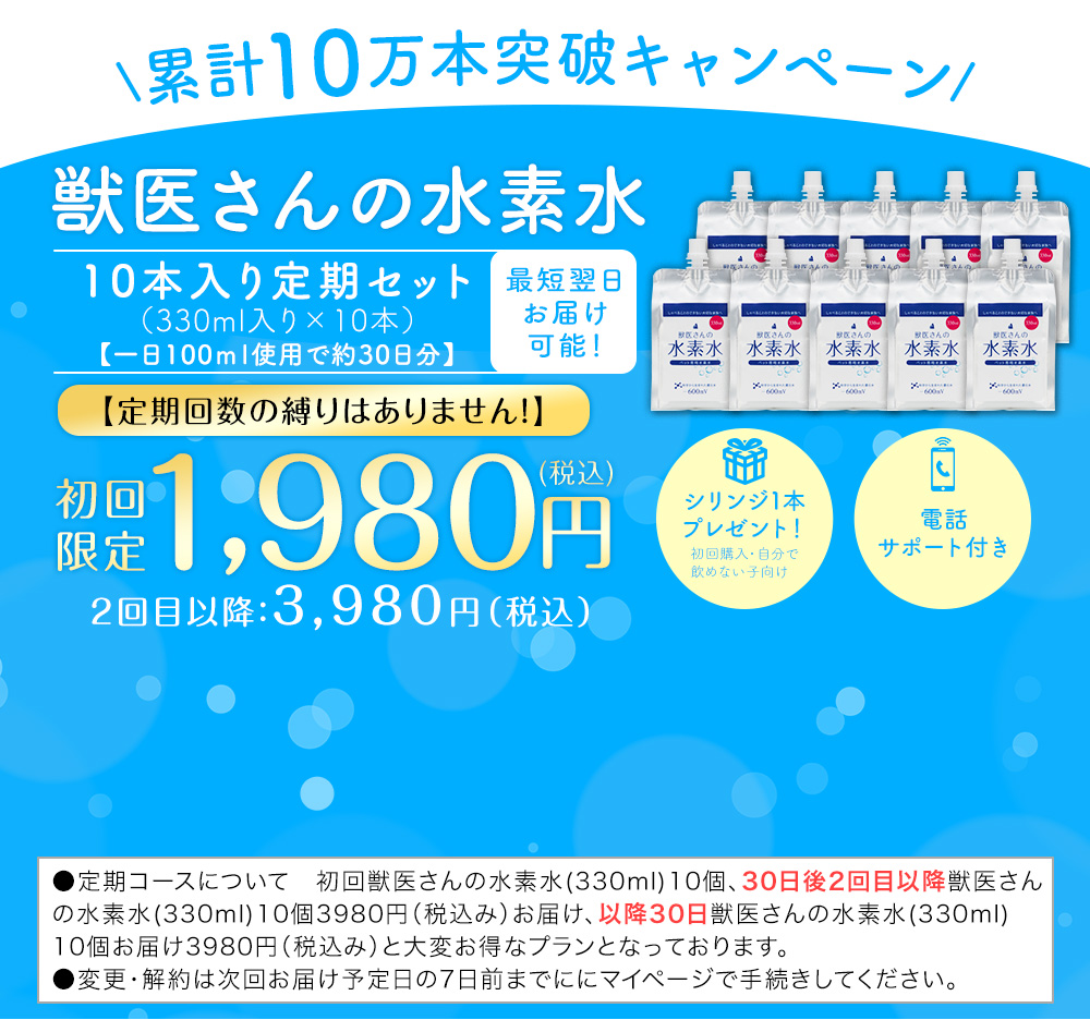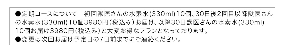 ※初回獣医さんの水素水(330ml)10個、30日後2回目獣医さんの水素水(330ml)10個お届け、以降30日獣医さんの水素水(330ml)10個お届け、お申込はお一人様1回限り。 〇お約束回数について なし(停止連絡がなければ継続的にお届け ※変更は次回お届け予定日の7日前までにご連絡下さい。